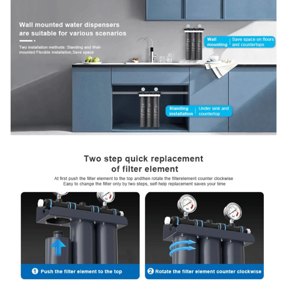 Multiple Filtration Combinations: Offers a variety of cartridge combinations to meet different water purification needs, with 15″ and 18″ cartridge options.