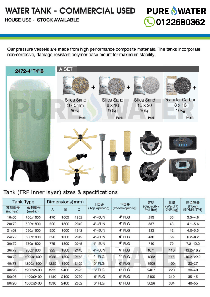 Our FRP Tank Commercial Industrial Water Media Filtration System is a high-performance solution designed for effective water treatment in industrial and commercial applications. Constructed from corrosion-resistant fiberglass-reinforced plastic (FRP), this system ensures durability, longevity, and low maintenance.