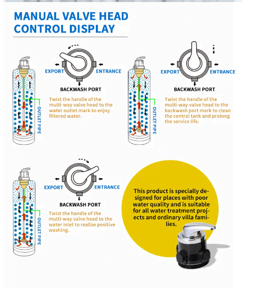 1. Backwash – 5 to 8mins (Wash the mud and dirt by turning the adjustable valve)
