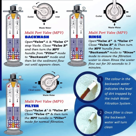 1. Backwash – 5 to 8mins (Wash the mud and dirt by turning the adjustable valve)