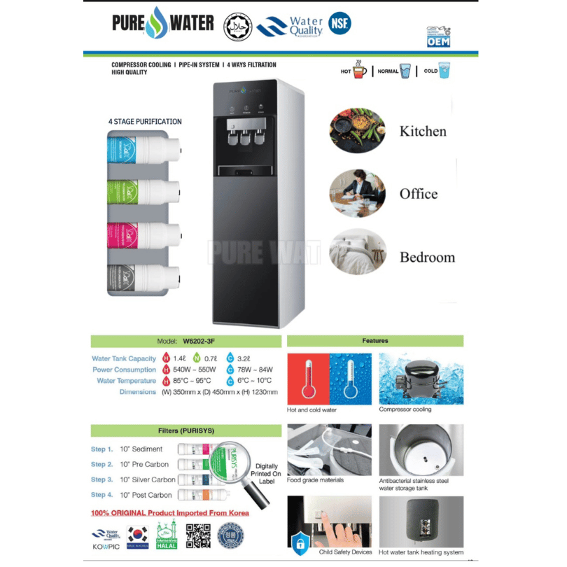 The W6202-3F Korea water dispenser boasts an array of features that set it apart from conventional models. Its robust construction ensures durability, while its sleek design adds a touch of elegance to any environment. Key specifications include: