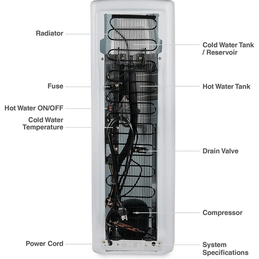 4) Heating and Cooling Switches – Hot and cold-water switches positioned at the back of the water dispenser – red for the heating, and green for the cooling.